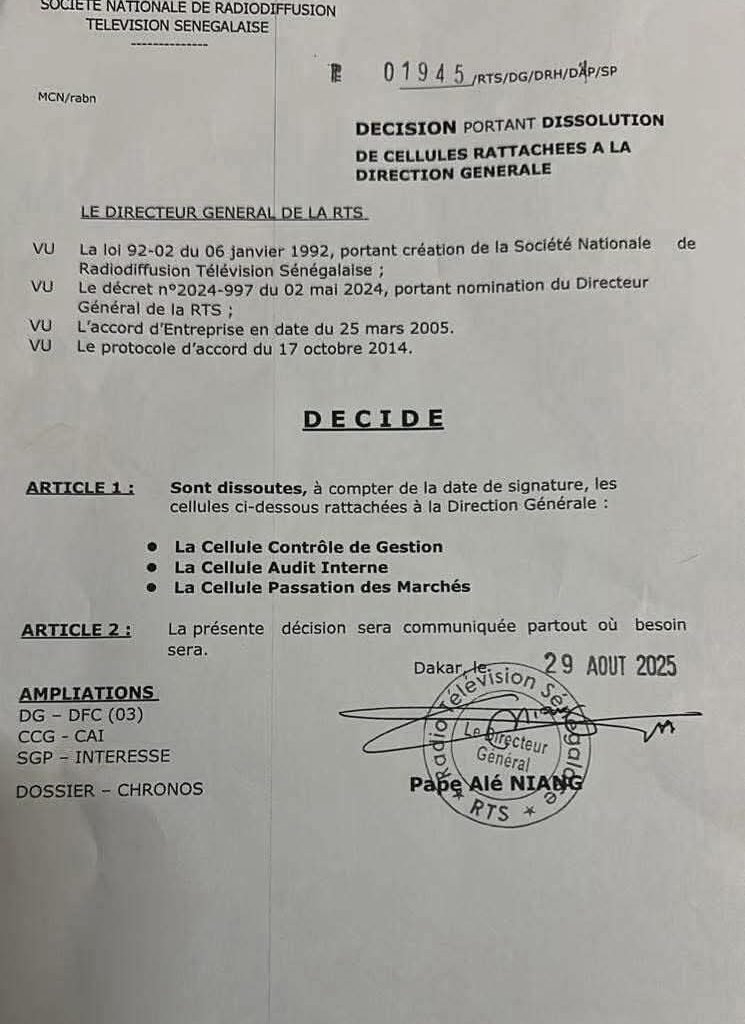 Le Directeur général de la Radiodiffusion Télévision Sénégalaise (RTS), Pape Alé Niang, a pris une décision importante en date du 29 août 2025. Par cette mesure, trois cellules jusque-là rattachées à la Direction générale sont dissoutes. Il s’agit de :